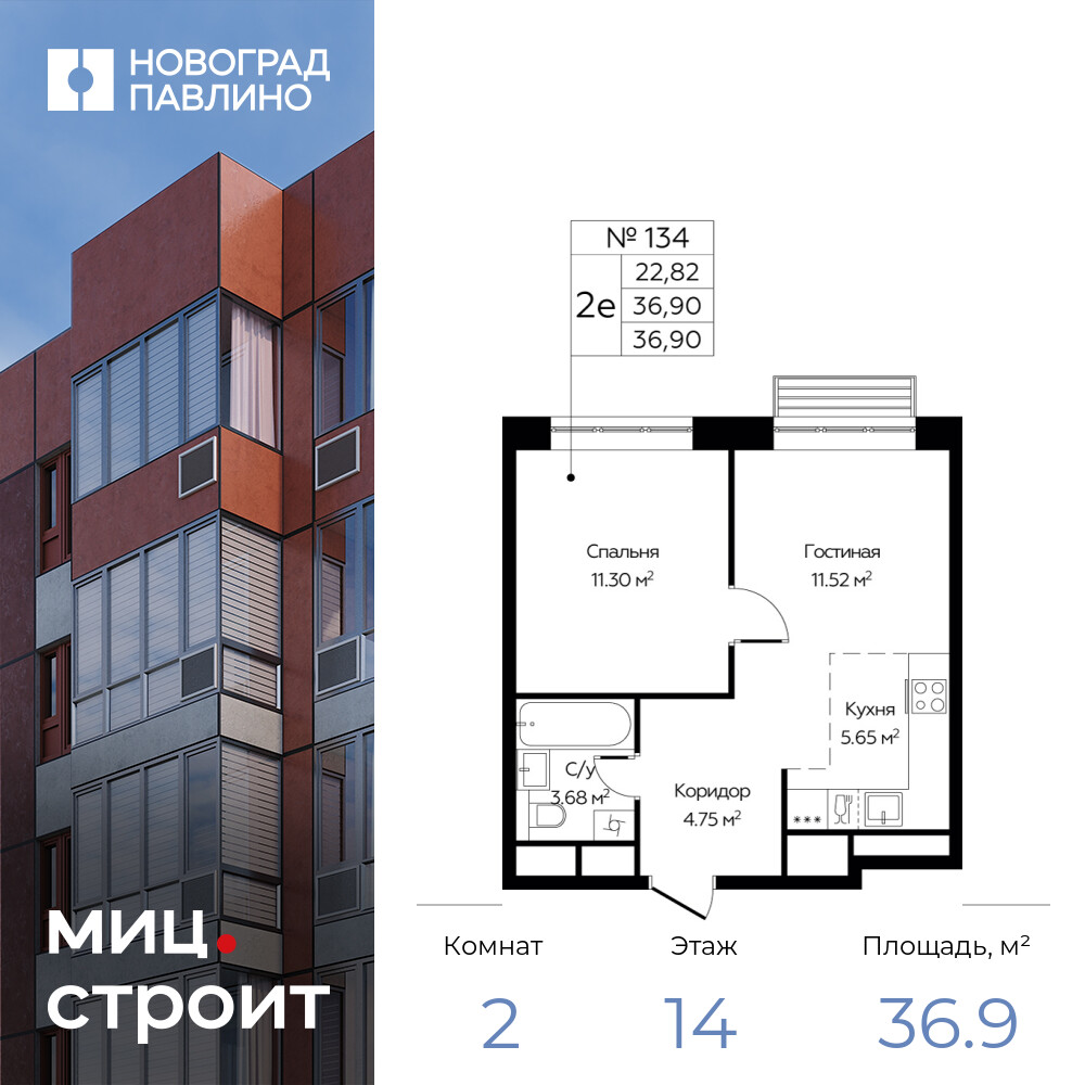 2х-комнатная квартира, 36.9 м2 в ЖК "Новоград Павлино"