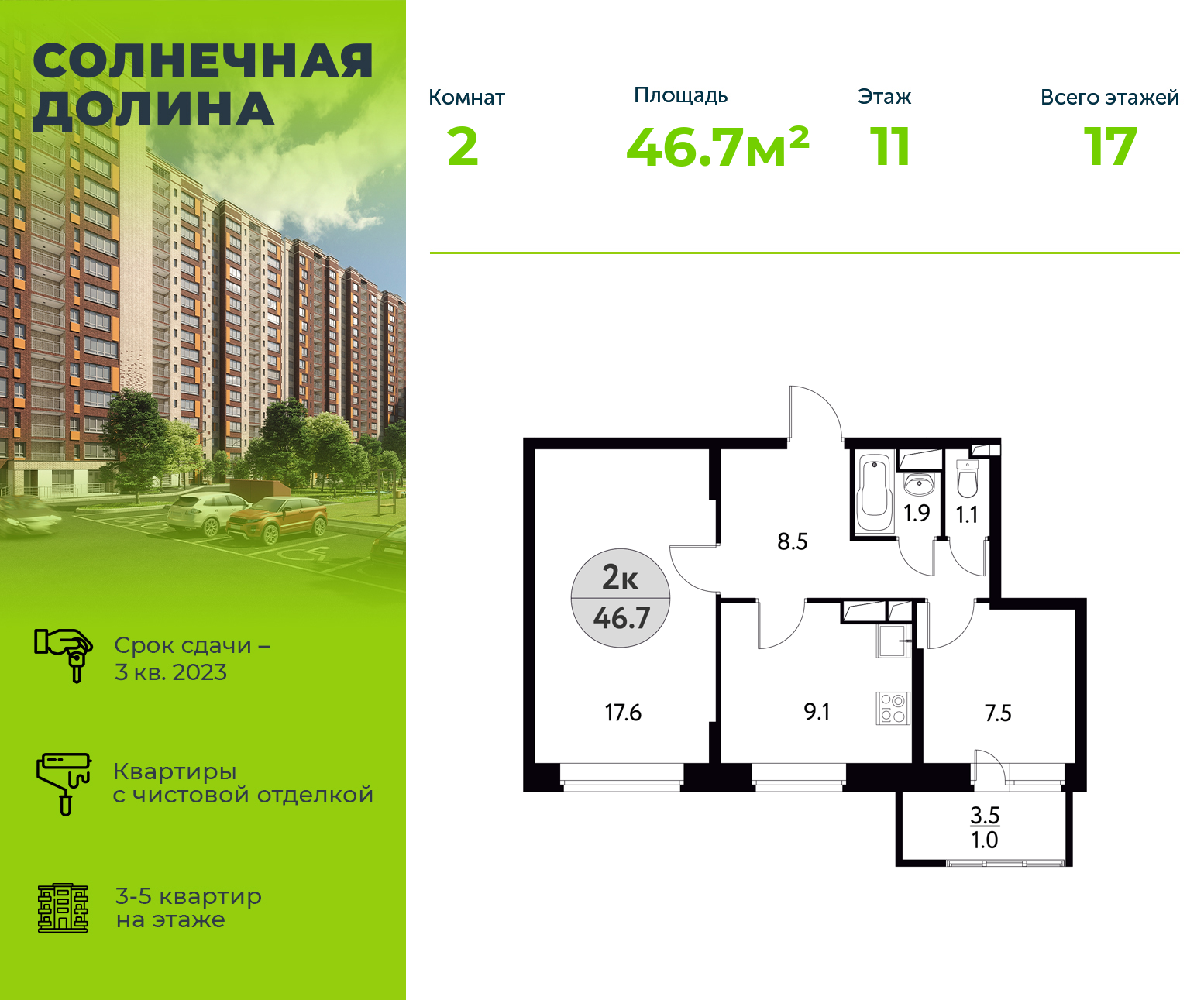 Продается 2х-комнатная квартира 46.7 м², площадь кухни 9.1 м². в ЖК Солнечная долина (г. Щелково) стоимостью 5 557 300 рублей. Квартира находится по адресу Фряновское шоссе, 64к1 недалеко от метро Щёлковская, Первомайская в районе Щелковский. Данная квартира находится на 11 этаже 17 этажного монолитного дома. Из общей 46.7 м², площадь кухни 9.1 м² к жилой относится 25.1м² , в квартире 2 комнаты. В нашем каталоге вы сможете найти и другие 2 комнатные квартиры в ЖК Солнечная долина (г. Щелково) со сроком сдачи III квартал 2023. от 2 900 000 рублей на нашем портале!