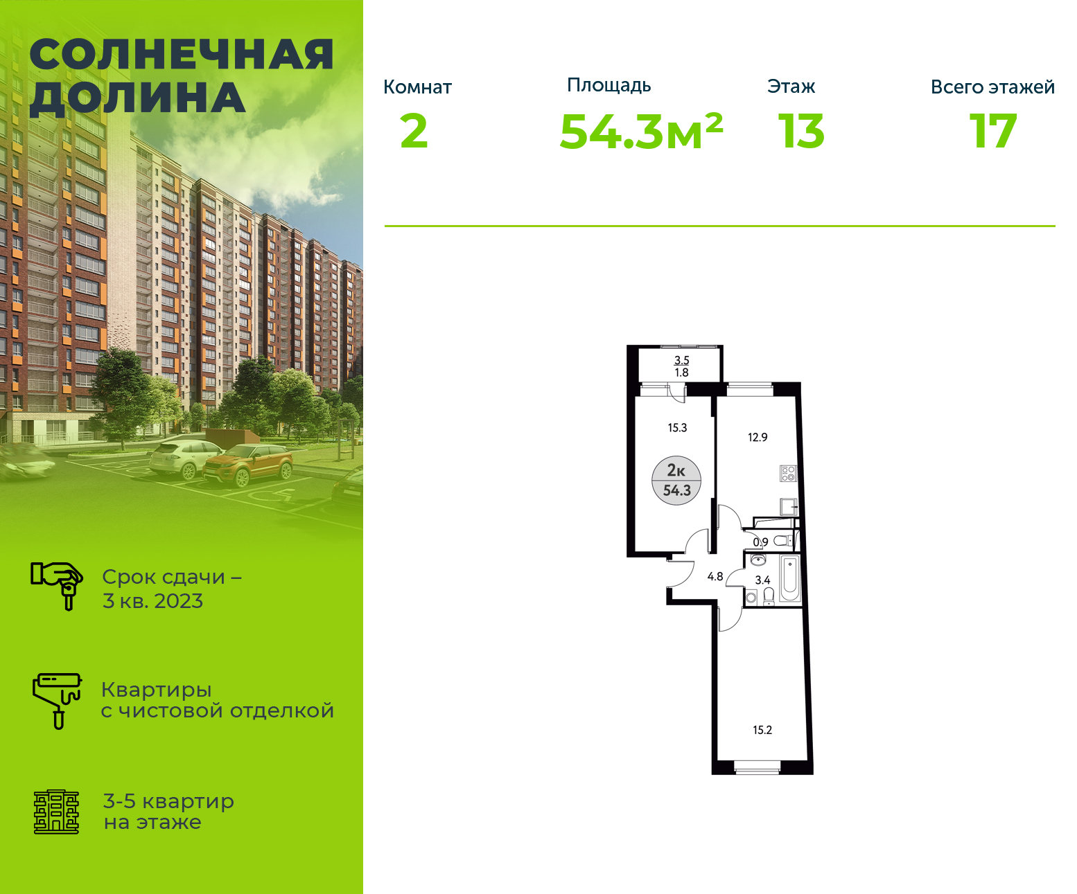 Продается 2х-комнатная квартира 54.3 м², площадь кухни 12.9 м². в ЖК Солнечная долина (г. Щелково) стоимостью 6 081 600 рублей. Квартира находится по адресу Фряновское шоссе, 64к1 недалеко от метро Щёлковская, Первомайская в районе Щелковский. Данная квартира находится на 13 этаже 17 этажного монолитного дома. Из общей 54.3 м², площадь кухни 12.9 м² к жилой относится 30.5м² , в квартире 2 комнаты. В нашем каталоге вы сможете найти и другие 2 комнатные квартиры в ЖК Солнечная долина (г. Щелково) со сроком сдачи III квартал 2023. от 2 900 000 рублей на нашем портале!