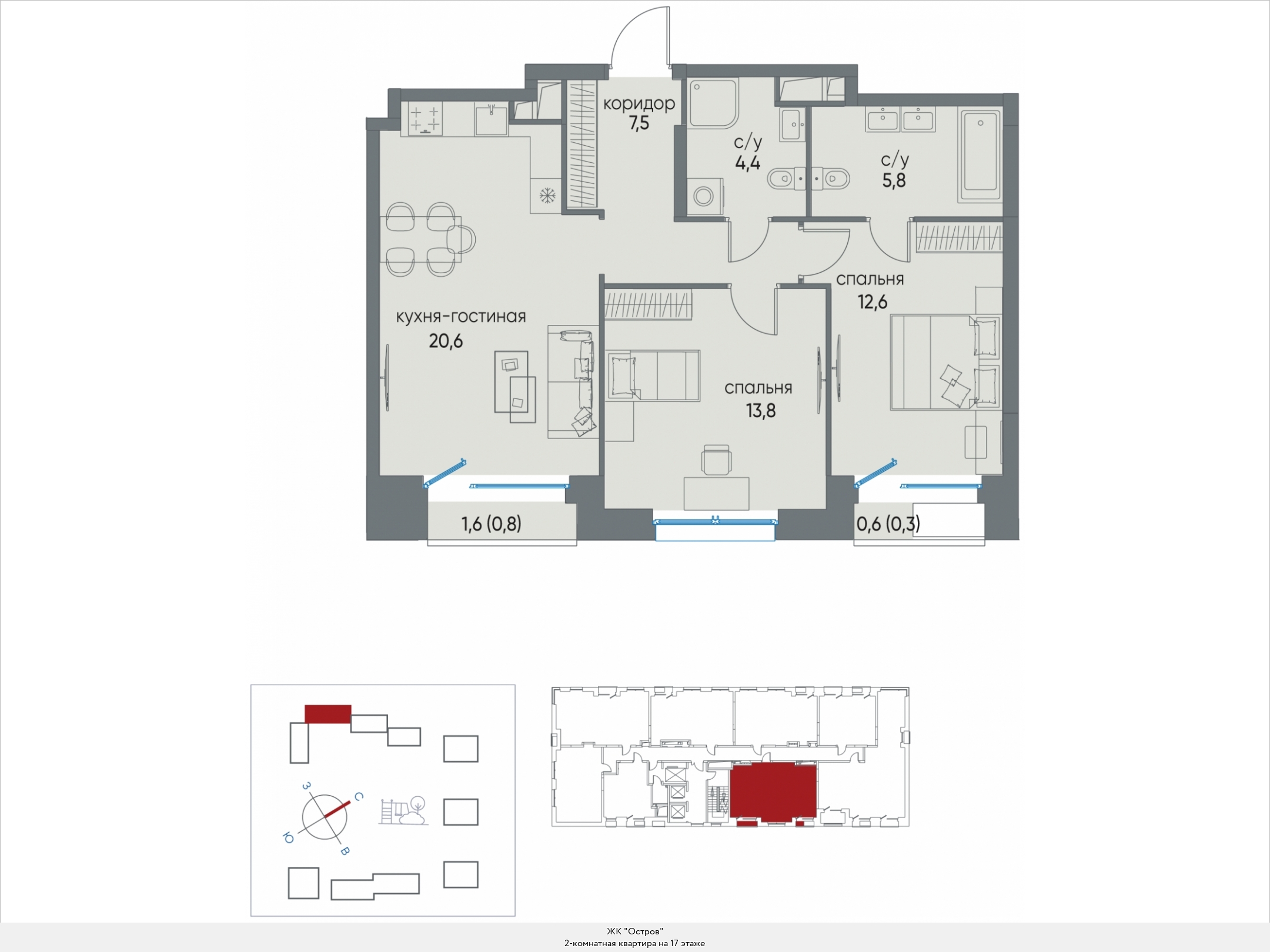 2х-комнатная квартира, 65.7 м2 в ЖК "Остров"