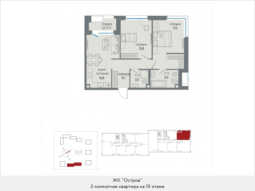 2х-комнатная квартира, 66.7 м2 в ЖК "Остров"