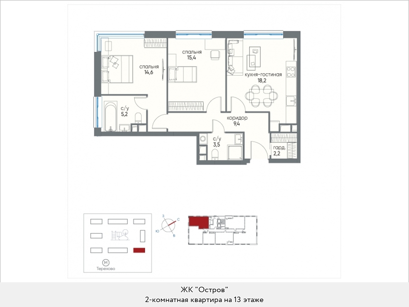 2х-комнатная квартира, 68.5 м2 в ЖК "Остров"