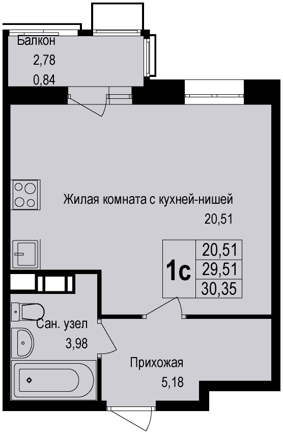 Квартира-студия, 30.39 м2 в ЖК "Новая Щербинка"