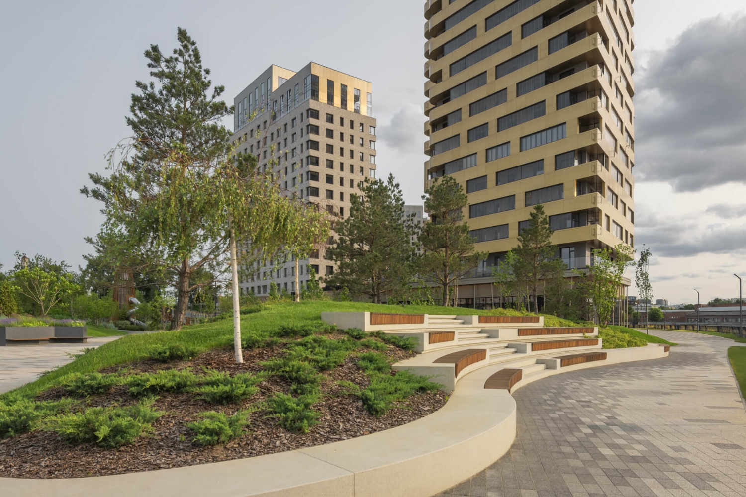 Квартал продуман до мелочей. Он состоит из двух полностью построенных очередей: Sky — восемь домов высотой 12–29 этажей, Line — 11 объединённых стилобатом домов высотой 12–29 этажей. У каждой очереди свои особенности и узнаваемые черты.