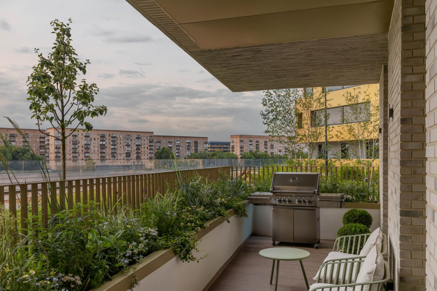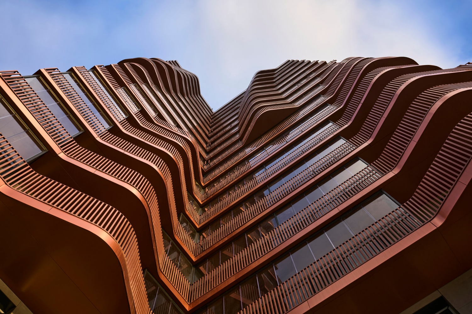 Трендовый облик корпусов Line, ассоциирующийся с колебаниями воды, разработан шведским архитектурным бюро Semrén & Månsson. Для фасадов использовано сочетание клинкерного кирпича и металлических панелей цвета латуни и меди. На территории обустроен двор с видовыми площадками для отдыха с деревянными шезлонгами и перголами. Резиденты наслаждаются эффектной панорамой Москвы-реки с шестиметровой возвышенности стилобата.
