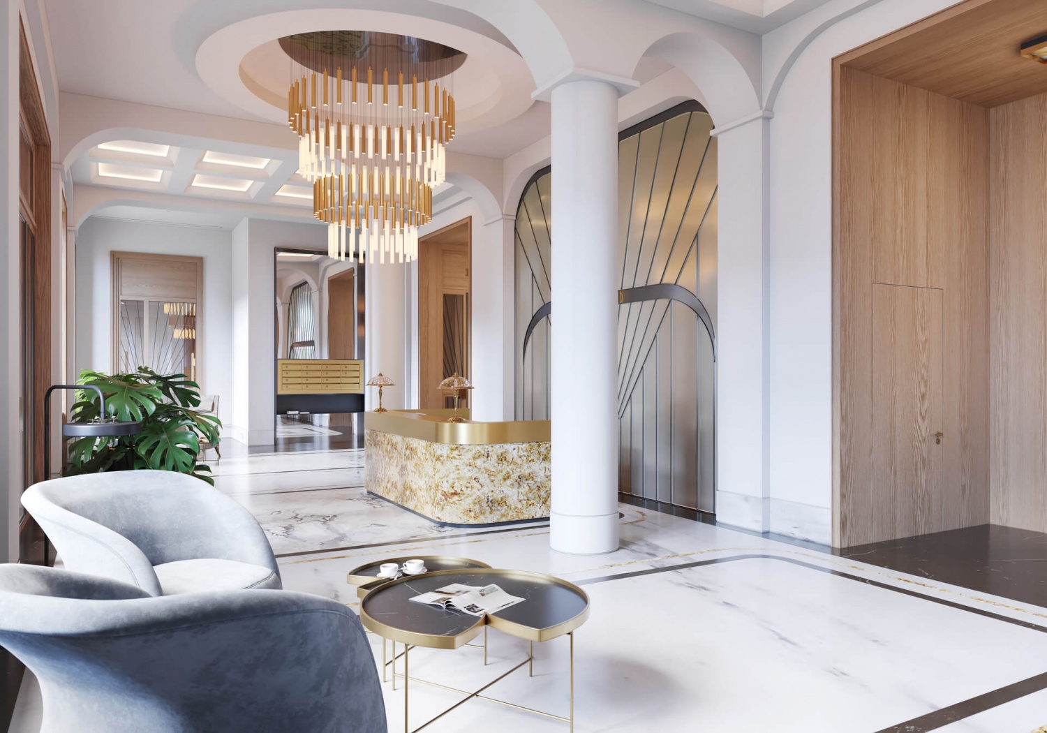 Для жителей создано просторное лобби с потолками высотой 4,7 метра и с отделкой из премиальных материалов. Здесь расположены комфортная зона для встреч гостей и ресепшен с консьержем. В доме представлены самые полные и лучшие в своём классе бесшумные системы комфорта. Для жителей предусмотрен высокотехнологичный автоматический подземный паркинг. Закрытая охраняемая территория оснащена системой видеонаблюдения.