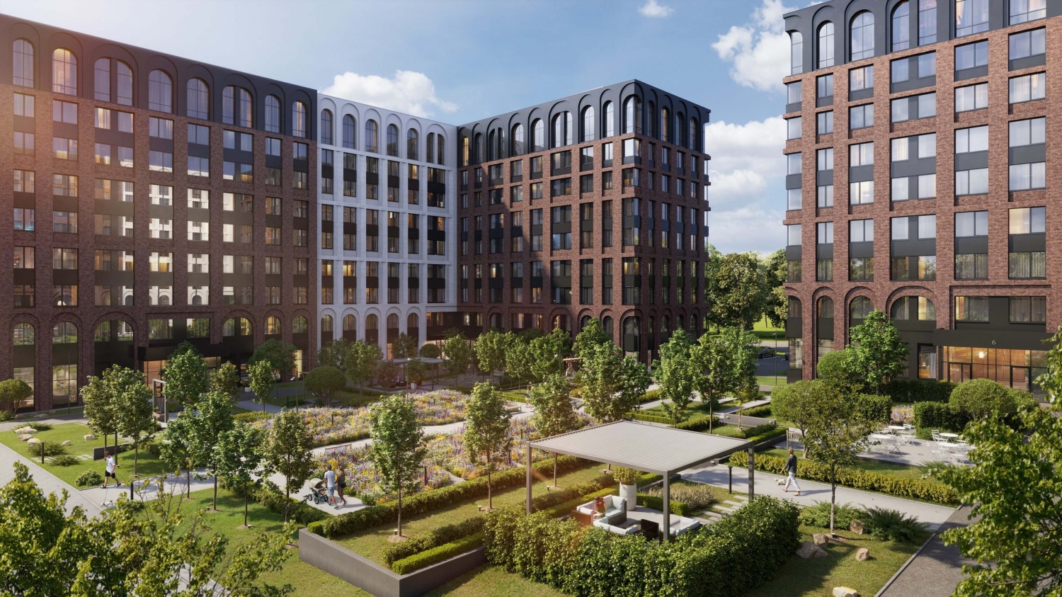 Внутренний двор вдохновлен эстетикой английского сада, где авторский ландшафтный дизайн интегрирован в пространство парка. Продуманные в единой стилистике игровые комплексы из эко материалов.