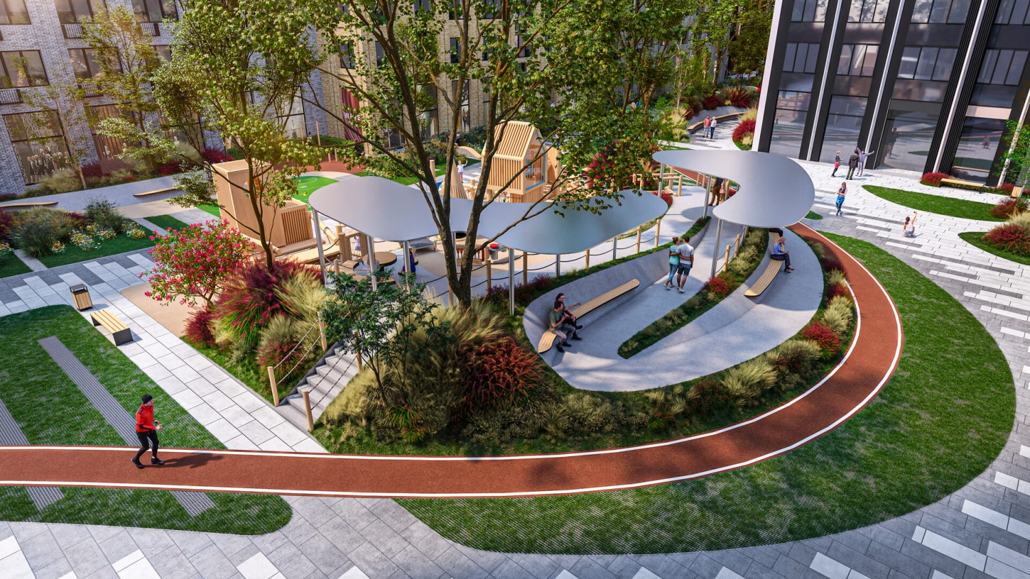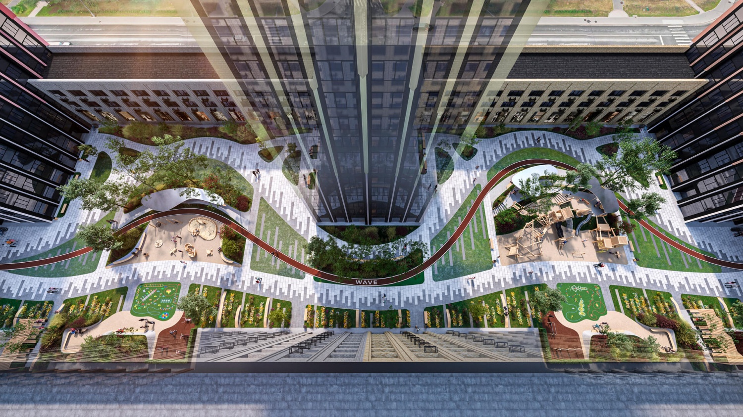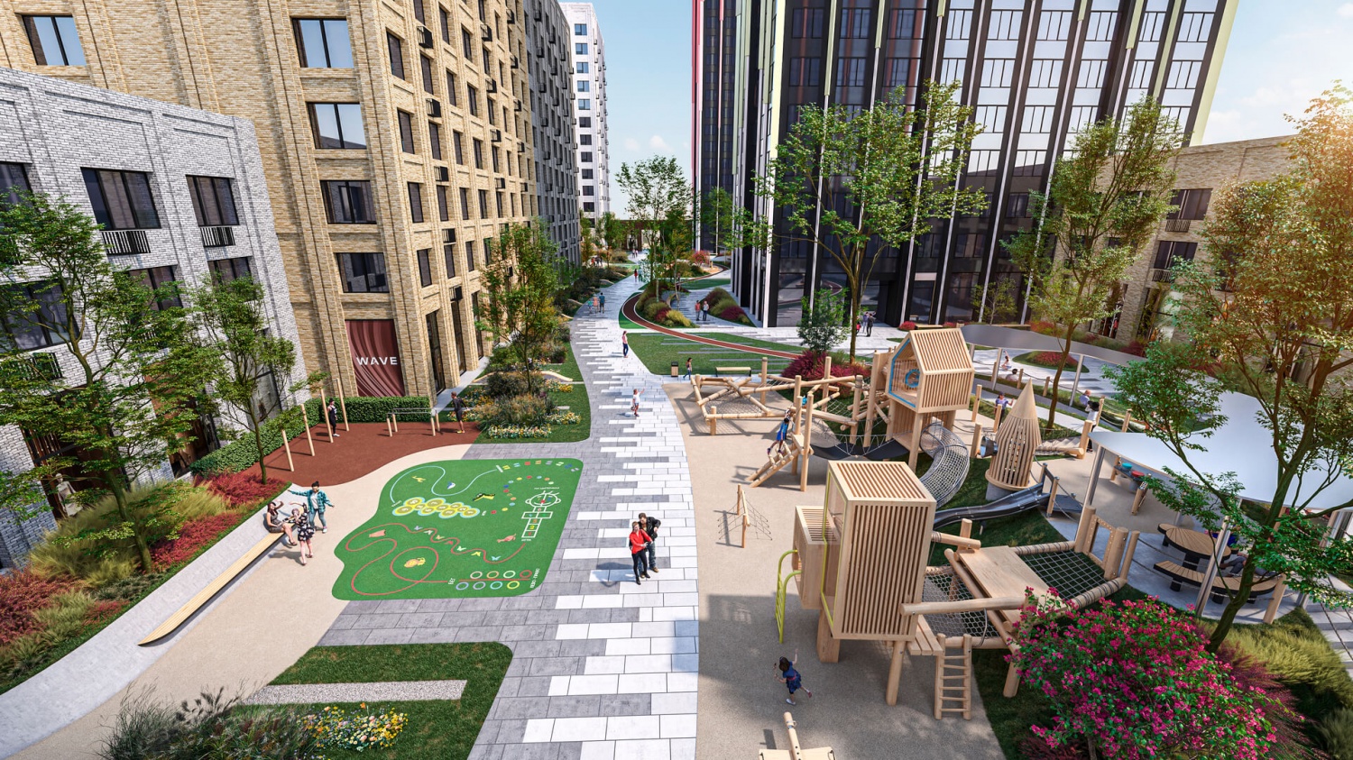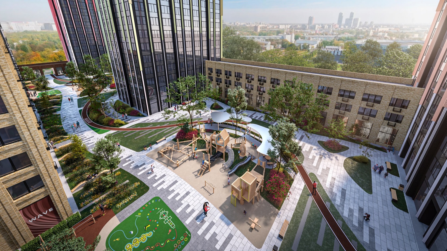 Внутренний двор WAVE поделен на несколько уровней: на первом расположатся детские площадки с песочницей и скалодромом, на втором – пространство отдыха для взрослых с мини-амфитеатром и зоной для коворкинга.