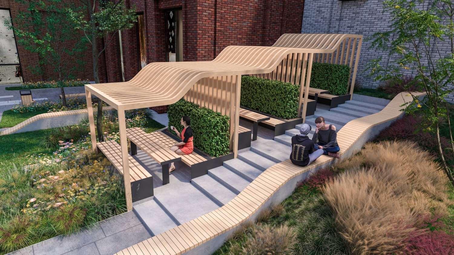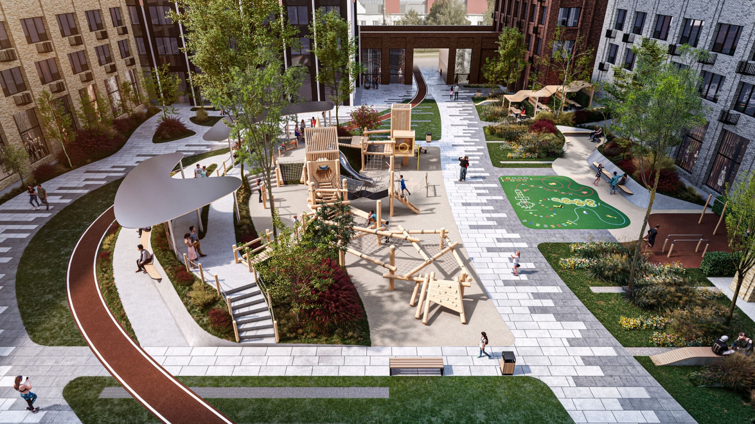 Приватный многоуровневый двор с беседками, мини-садом, детская зона с площадками и скалодромом, амфитеатр