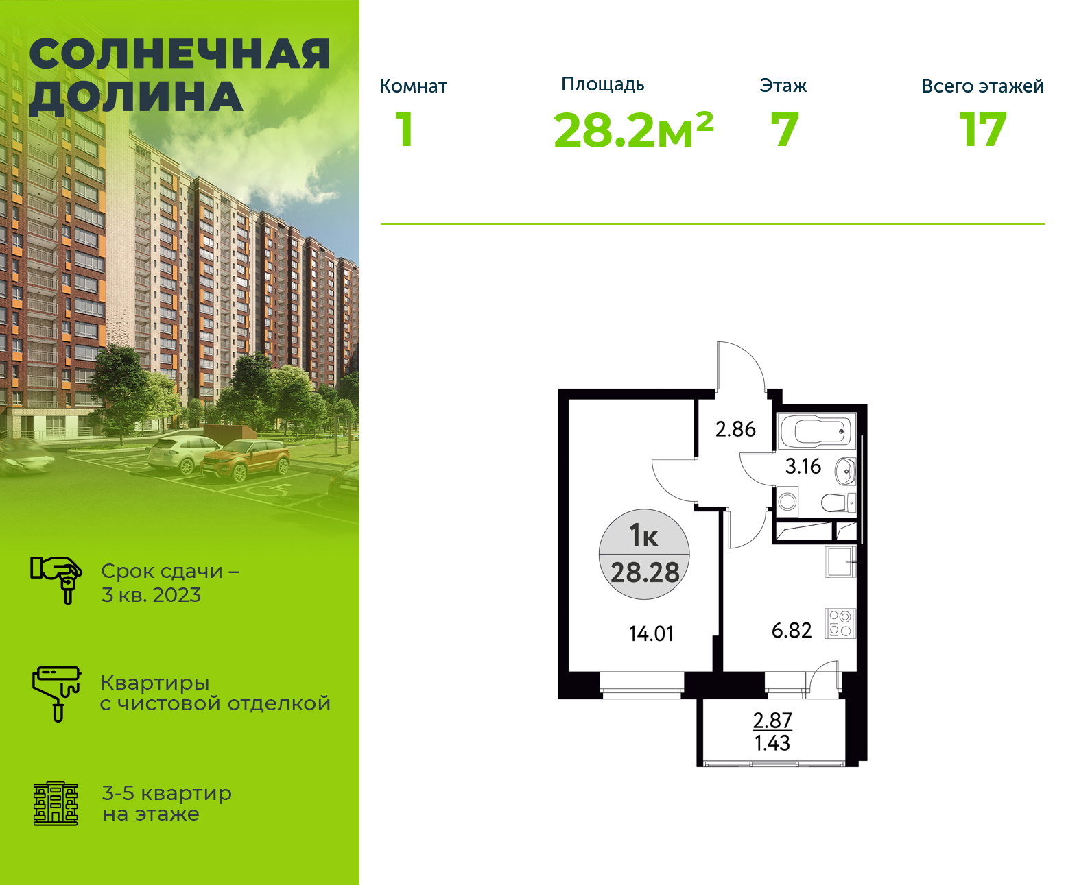 Продается 1-комнатная квартира 28.28 м², площадь кухни 6.82 м². в ЖК Солнечная долина (г. Щелково) стоимостью 4 128 880 рублей. Квартира находится по адресу Фряновское шоссе, 64к1 недалеко от метро Щёлковская, Первомайская в районе Щелковский. Данная квартира находится на 7 этаже 17 этажного монолитного дома. Из общей 28.28 м², площадь кухни 6.82 м² к жилой относится 14.01м² , в квартире 1 комната. В нашем каталоге вы сможете найти и другие 1 комнатные квартиры в ЖК Солнечная долина (г. Щелково) со сроком сдачи III квартал 2023. от 2 900 000 рублей на нашем портале!