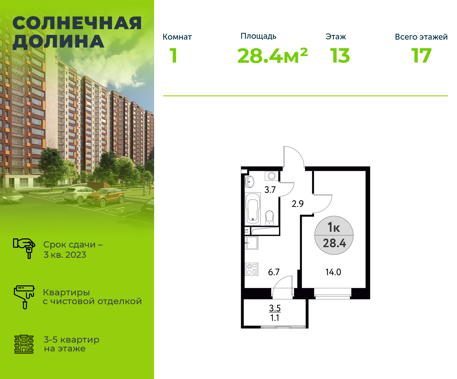 Продается 1-комнатная квартира 28.4 м², площадь кухни 6.7 м². в ЖК Солнечная долина (г. Щелково) стоимостью 4 231 600 рублей. Квартира находится по адресу Фряновское шоссе, 64к1 недалеко от метро Щёлковская, Первомайская в районе Щелковский. Данная квартира находится на 13 этаже 17 этажного монолитного дома. Из общей 28.4 м², площадь кухни 6.7 м² к жилой относится 14м² , в квартире 1 комната. В нашем каталоге вы сможете найти и другие 1 комнатные квартиры в ЖК Солнечная долина (г. Щелково) со сроком сдачи III квартал 2023. от 2 900 000 рублей на нашем портале!