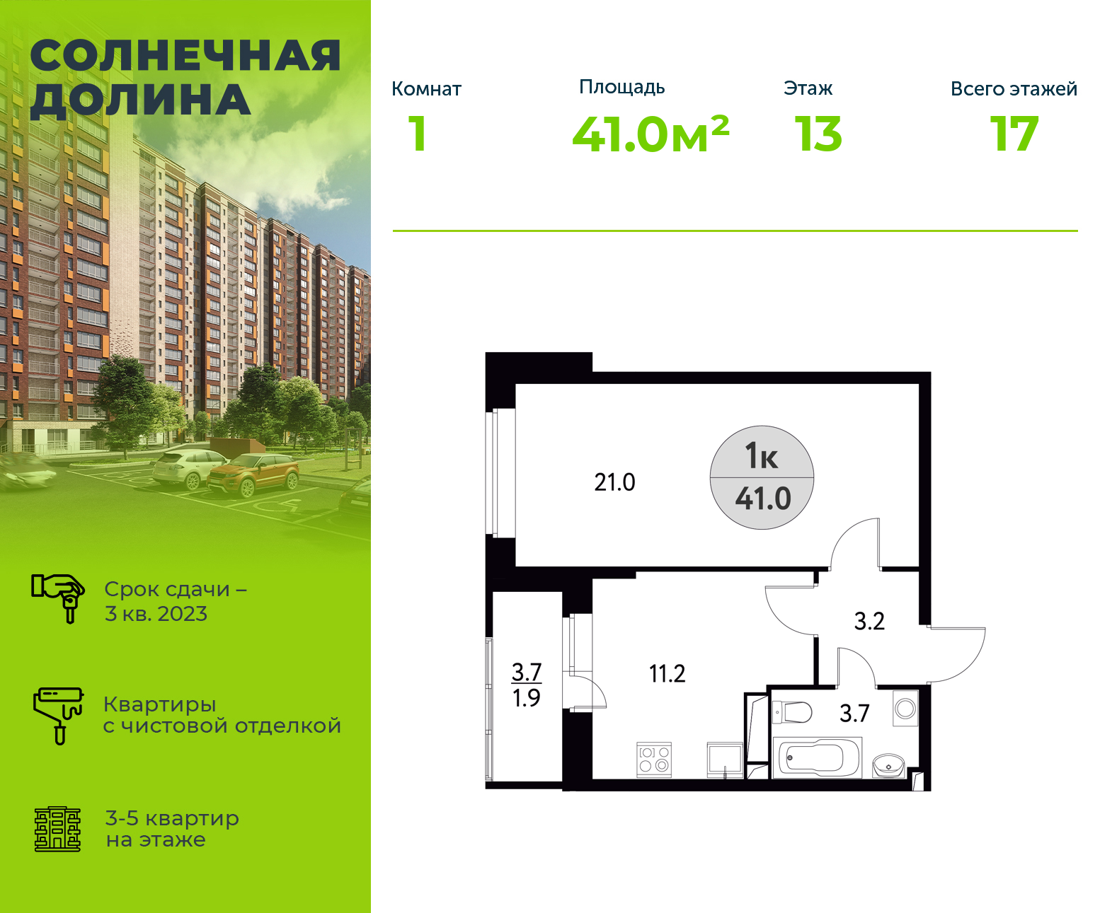 Продается 1-комнатная квартира 41 м², площадь кухни 11.2 м². в ЖК Солнечная долина (г. Щелково) стоимостью 4 879 000 рублей. Квартира находится по адресу Фряновское шоссе, 64к1 недалеко от метро Щёлковская, Первомайская в районе Щелковский. Данная квартира находится на 13 этаже 17 этажного монолитного дома. Из общей 41 м², площадь кухни 11.2 м² к жилой относится 21м² , в квартире 1 комната. В нашем каталоге вы сможете найти и другие 1 комнатные квартиры в ЖК Солнечная долина (г. Щелково) со сроком сдачи III квартал 2023. от 2 900 000 рублей на нашем портале!