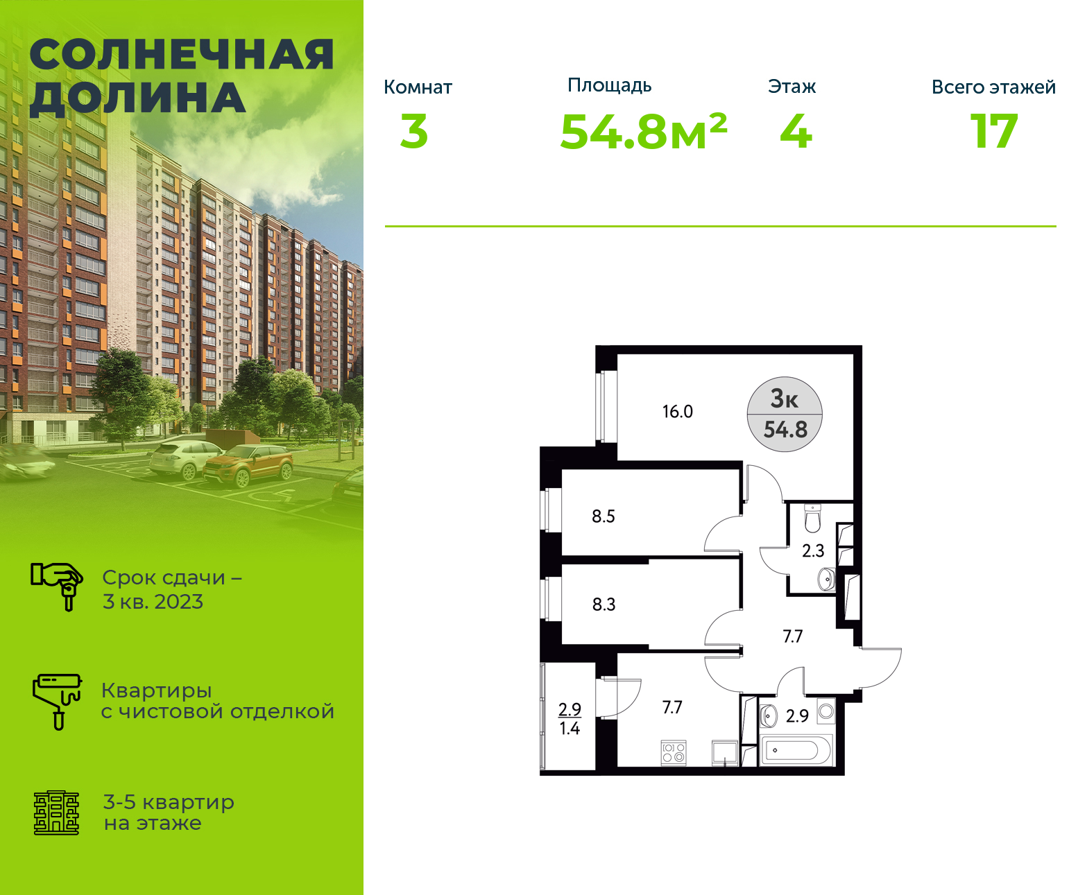 Продается 3х-комнатная квартира 54.8 м², площадь кухни 7.7 м². в ЖК Солнечная долина (г. Щелково) стоимостью 6 576 000 рублей. Квартира находится по адресу Фряновское шоссе, 64к1 недалеко от метро Щёлковская, Первомайская в районе Щелковский. Данная квартира находится на 4 этаже 17 этажного монолитного дома. Из общей 54.8 м², площадь кухни 7.7 м² к жилой относится 32.8м² , в квартире 3 комнаты. В нашем каталоге вы сможете найти и другие 3 комнатные квартиры в ЖК Солнечная долина (г. Щелково) со сроком сдачи III квартал 2023. от 2 900 000 рублей на нашем портале!